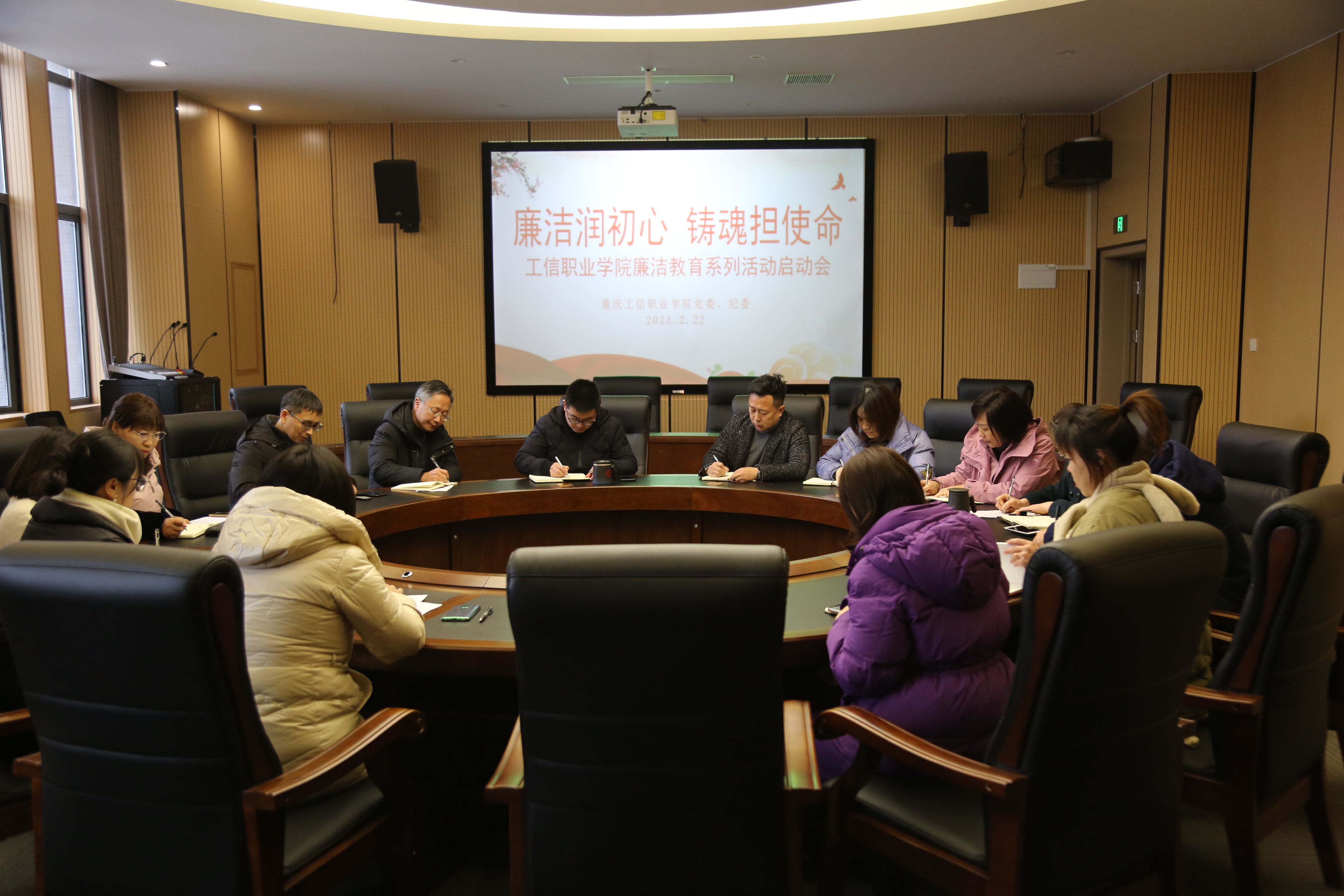 会上,纪委书记金文娟围绕活动背景、活动主题、参赛项目等方面详细解读了《中共重庆工信职业学院纪律检查委员会关于开展“廉洁润初心 铸魂担使命”廉洁教育活动的通知》内容。并提出三点要求:一要提高站位,高度重视,要将此次活动作为学习贯彻党的二十大精神、落实中央决策部署的重要举措,加强组织领导,充分调动全体师生的参与积极性,把加强大学生廉洁教育工作作为思想政治教育和课堂教育的重要内容,认真将活动的各项任务落到实处;二是组织规范,注重实效,各分管领导要加强对此次活动的检查指导,各部门、各二级学院负责人要严把政治关、质量关和公正关,坚持原创,坚持正确的舆论导向和价值取向;三是强化宣传,营造浓厚氛围,要坚持双向互动、文化联动、共同提升,全面加强校园廉洁文化建设,推动廉洁文化建设实起来、强起来,不断营造风清气正的良好育人政治生态。