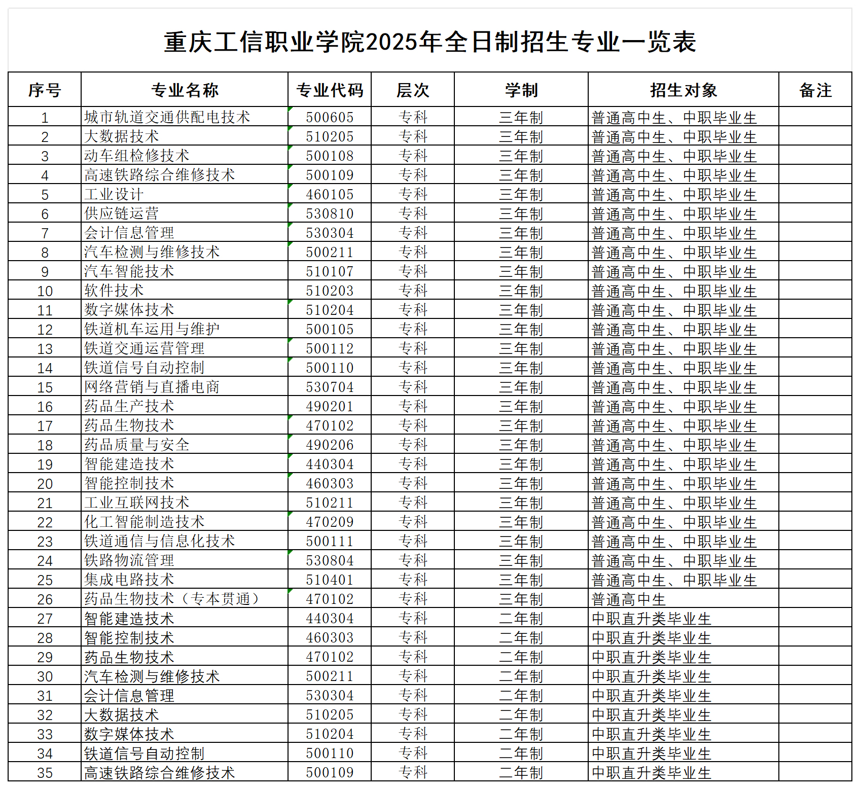 重庆工信职业学院2025年全日制招生专业一览表