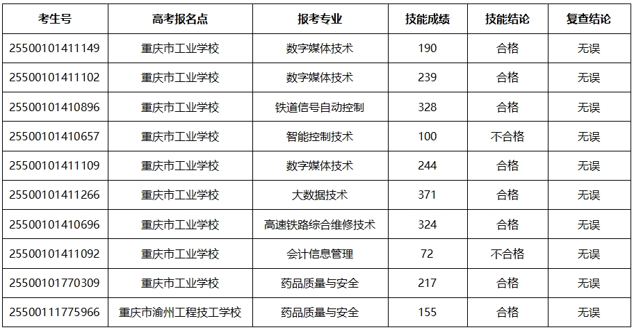 根据《重庆市教育委员会关于印发2025年重庆市高等职业教育分类考试招生工作实施办法的通知》(渝教招函〔2024〕17号)、《重庆市教育考试院关于做好重庆市2025年高职分类考试招生有关工作的通知》(渝教考发[2025]2号)等文件精神,等文件精神,现将我校重庆市2025年高职分类考试招生其他类职业技能测试成绩复核结果通知如下: