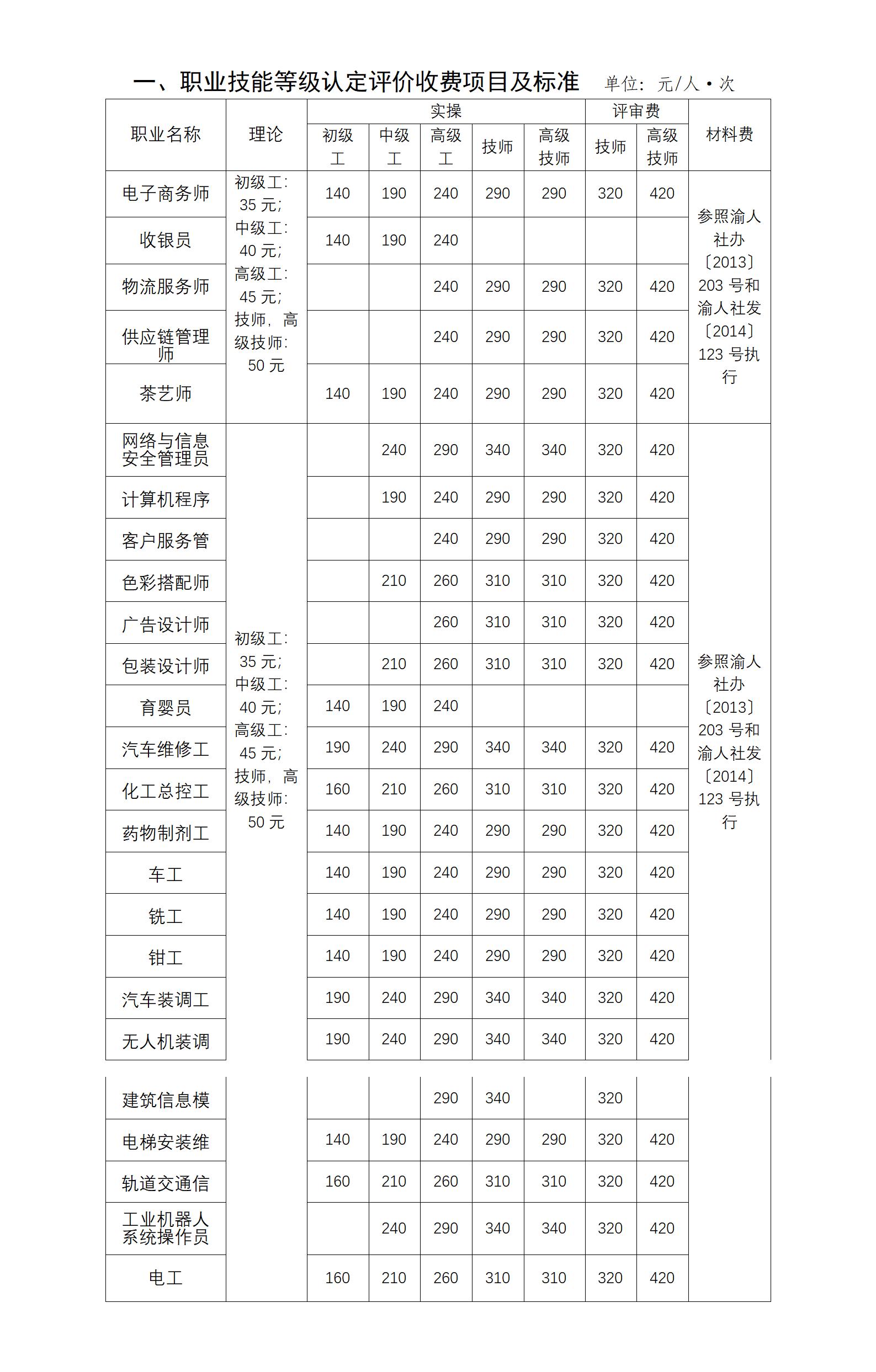 2.以上职业技能等级认定材料费结合实际情况及渝人社办〔2013〕203号和渝人社发〔2014〕123号文执行。
