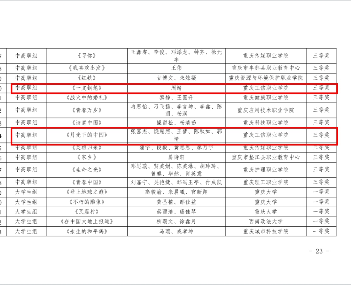 本次大赛于2024年5月至7月期间在全市范围内举行,经典诵读大赛共收到来自区县、高校及有关单位的611份参赛作品,竞争异常激烈。我校经过精心准备和严格筛选,最终推荐了两份优秀作品参赛,分别是信息工程学院学生周婧的《一支钢笔》和张富杰、饶恩熙、王倩、陈秋如、郭靖共同演绎的《月光下的中国》,纷纷获得大赛三等奖。