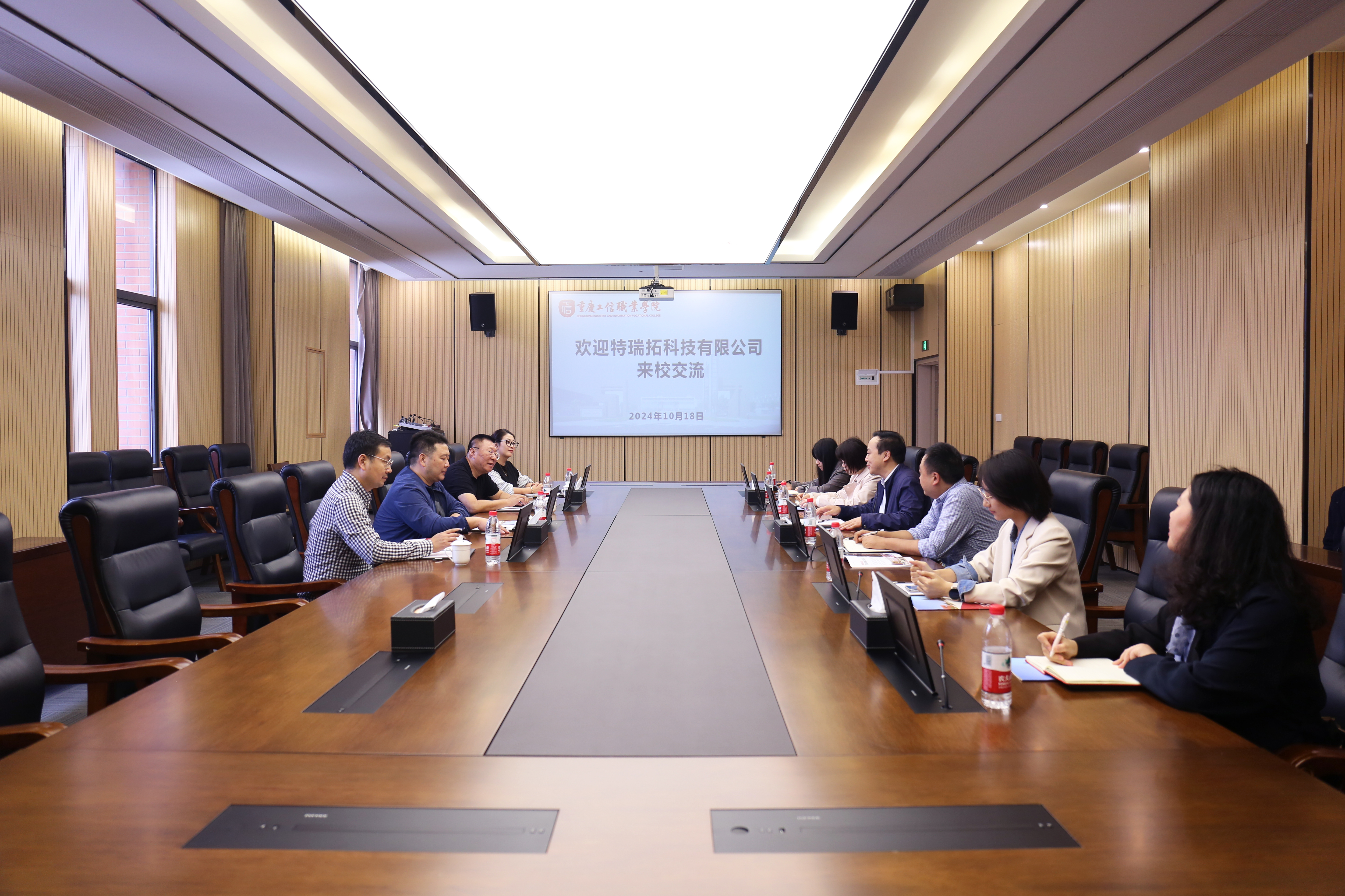 随后,政校企三方在立德楼1318会议室召开了座谈交流会议。党委委员、副院长柴彬堂主持本次会议,介绍了学校发展历程及现状,并表达了对深入开展校企合作的诚挚期望。特瑞拓科技有限公司总裁宫群介绍了其公司发展背景、业务经营范围、校企合作开展情况,以及探索人才培养新模式的具体想法。其后,双方就校企合作方向及合作方式进行了深入交谈,同时,特瑞拓科技有限公司邀请我校近期去实地考察。最后,重庆市经济和信息化委员会招商处四级调研员王中瑜对校企双方的真诚交流表示了认可,并对合作的落地表达了殷切期望。
