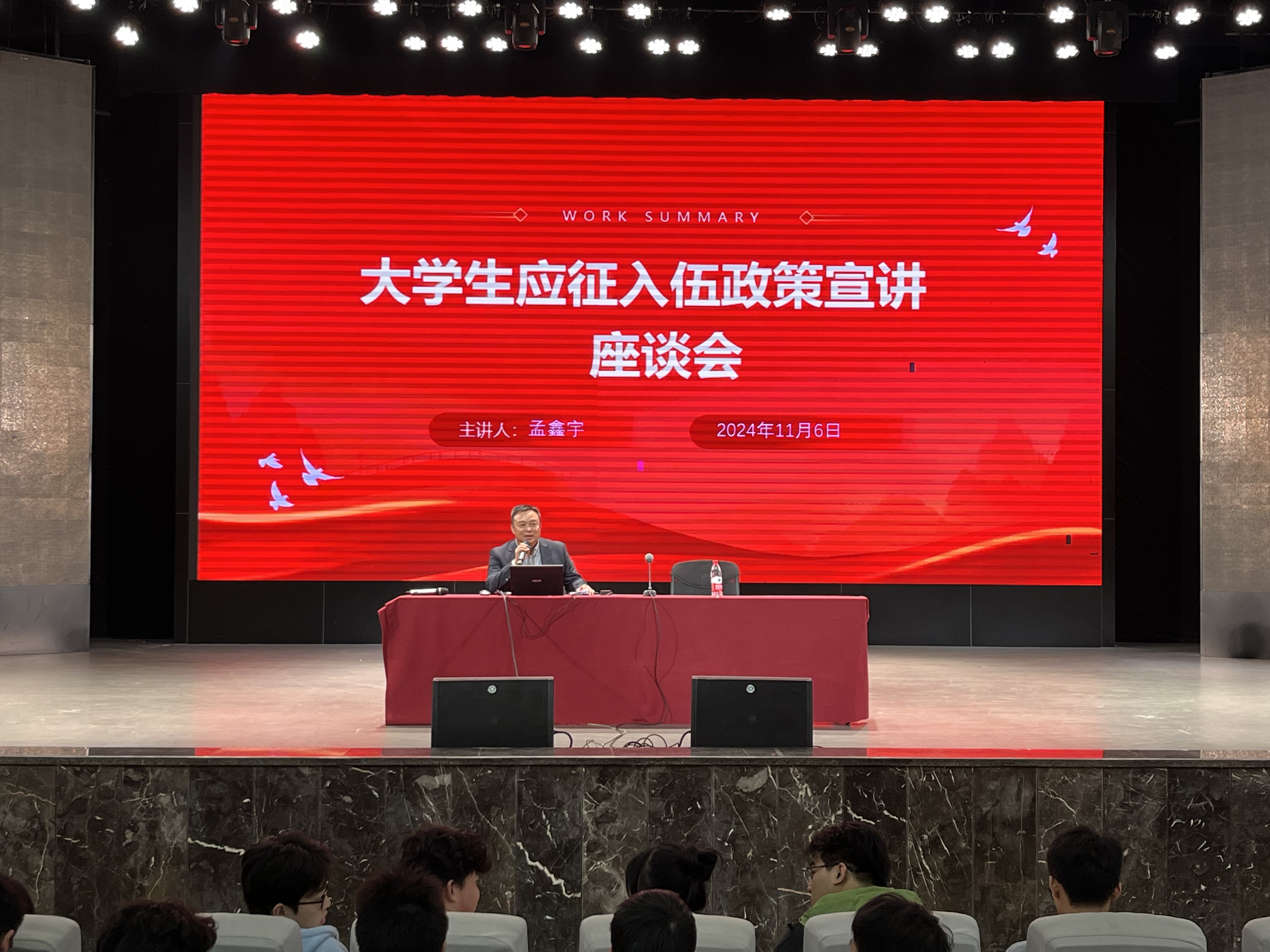 会上,孟老师全面而细致地解读了报名参军的相关流程、国家对大学生参军的优惠政策以及优惠政策申请与审批的具体步骤,还着重阐述了退役后的相关政策安排。这些政策涵盖了学费补偿、国家助学贷款代偿、退役后复学等多个方面。