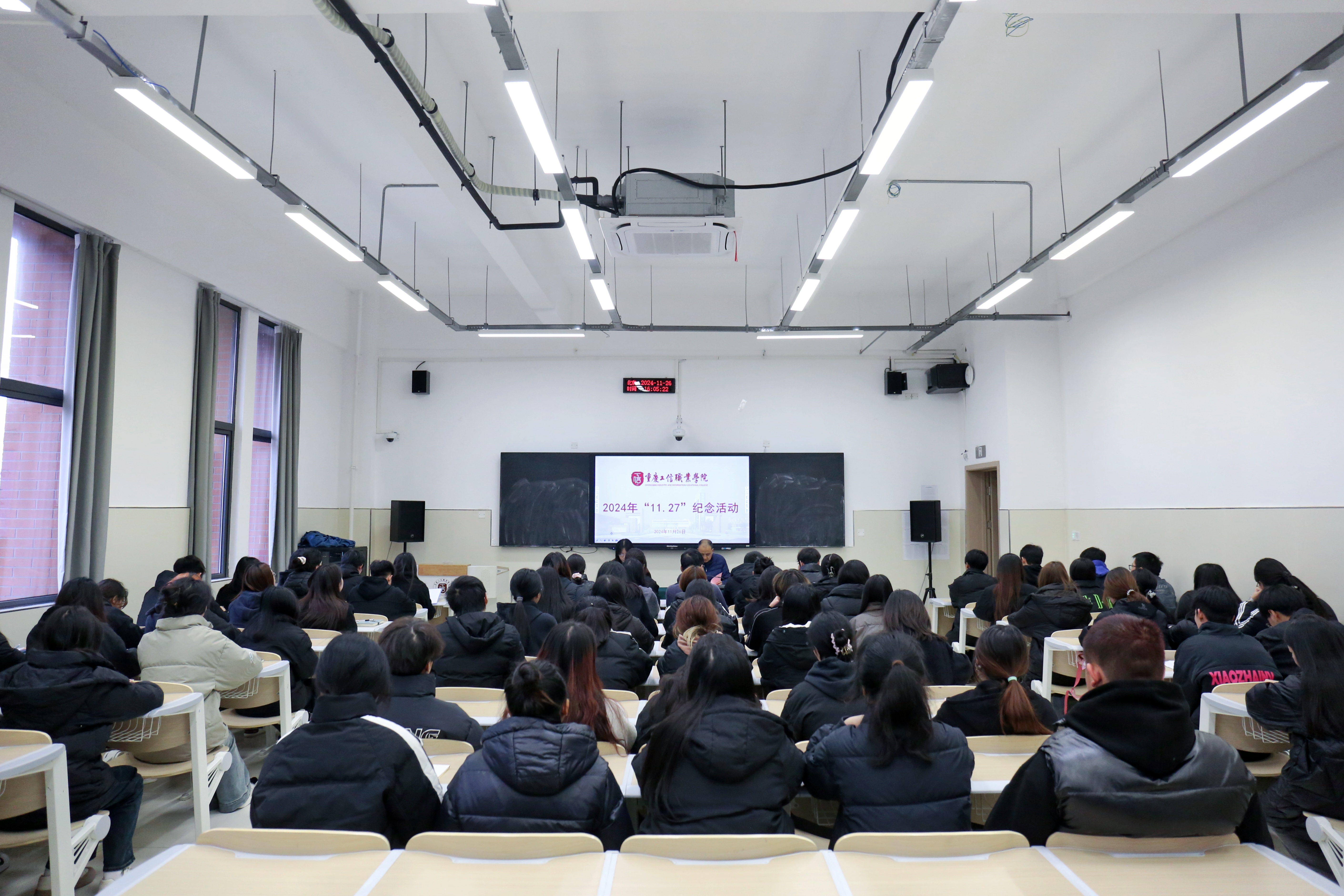 活动在校团委李璐璐老师的主持下正式开始,伴随着中华人民共和国国歌的奏响,全场肃立,表达对祖国的无限敬意。铁道运营231班的桂子茹同学和数字媒体243班的黄鹏铖同学分别上台,深情分享了“11·27”事件的相关故事,将那段峥嵘岁月的历史记忆再次唤醒。