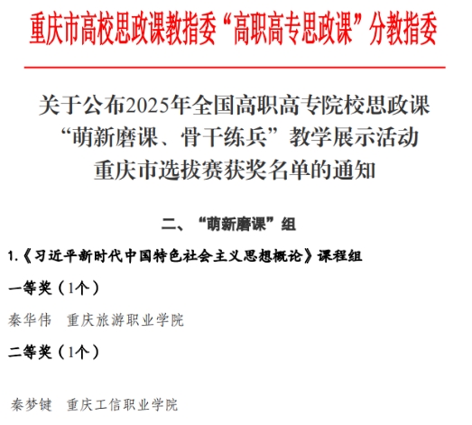 近日,2025年全国高职高专院校思政课“萌新磨课、骨干练兵”教学展示活动重庆市选拔赛圆满落幕。本次比赛由重庆市教育委员会指导、重庆市高校思政课教指委“高职高专思政课”分教指 委主办,共收到参赛作品79个,共评出特等奖 4 个、一等奖 10个、二等奖 11个。经过激烈角逐,我校秦梦键老师凭借扎实的理论功底、创新的教学设计,从比赛中脱颖而出,在“萌新磨课”组中荣获《习近平新时代中国特色社会主义思想概论》课程组二等奖。