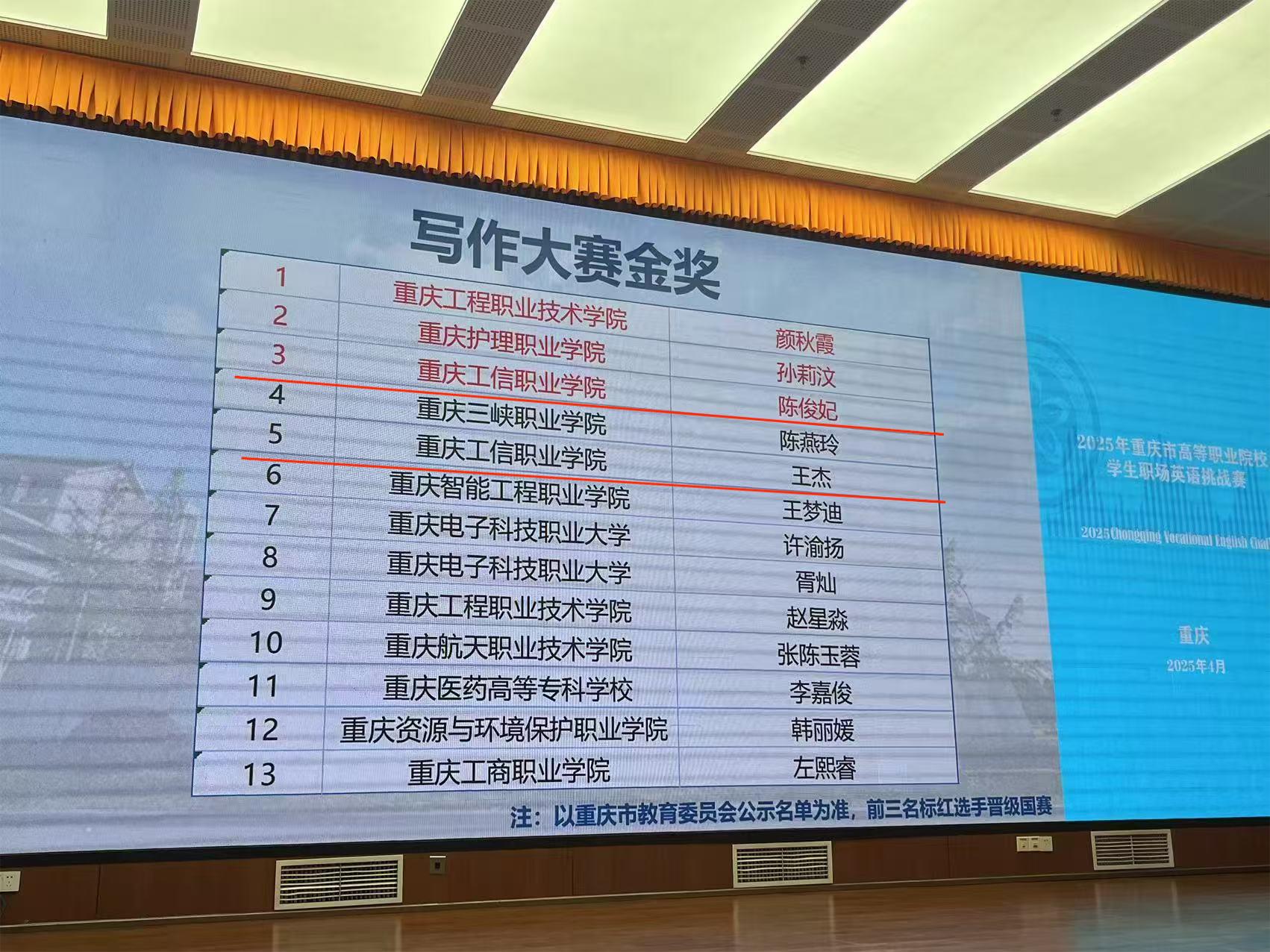 2025年4月26日,2025年重庆市高等职业院校学生职场英语挑战赛在重庆工程职业技术学院成功举办。本次赛事由重庆市教育委员会主办,全市44所高职院校的275名选手踊跃参与。经过激烈角逐,我校参赛选手获得2金2铜的优异成绩,其中陈俊妃、王杰荣获写作赛项金奖,陈俊妃将代表重庆赛区参加2025“中国教育电视台·外研社杯”职场英语挑战赛写作大赛全国决赛;刘诚淳荣获写作赛项铜奖;饶睿荣获演讲赛项铜奖。