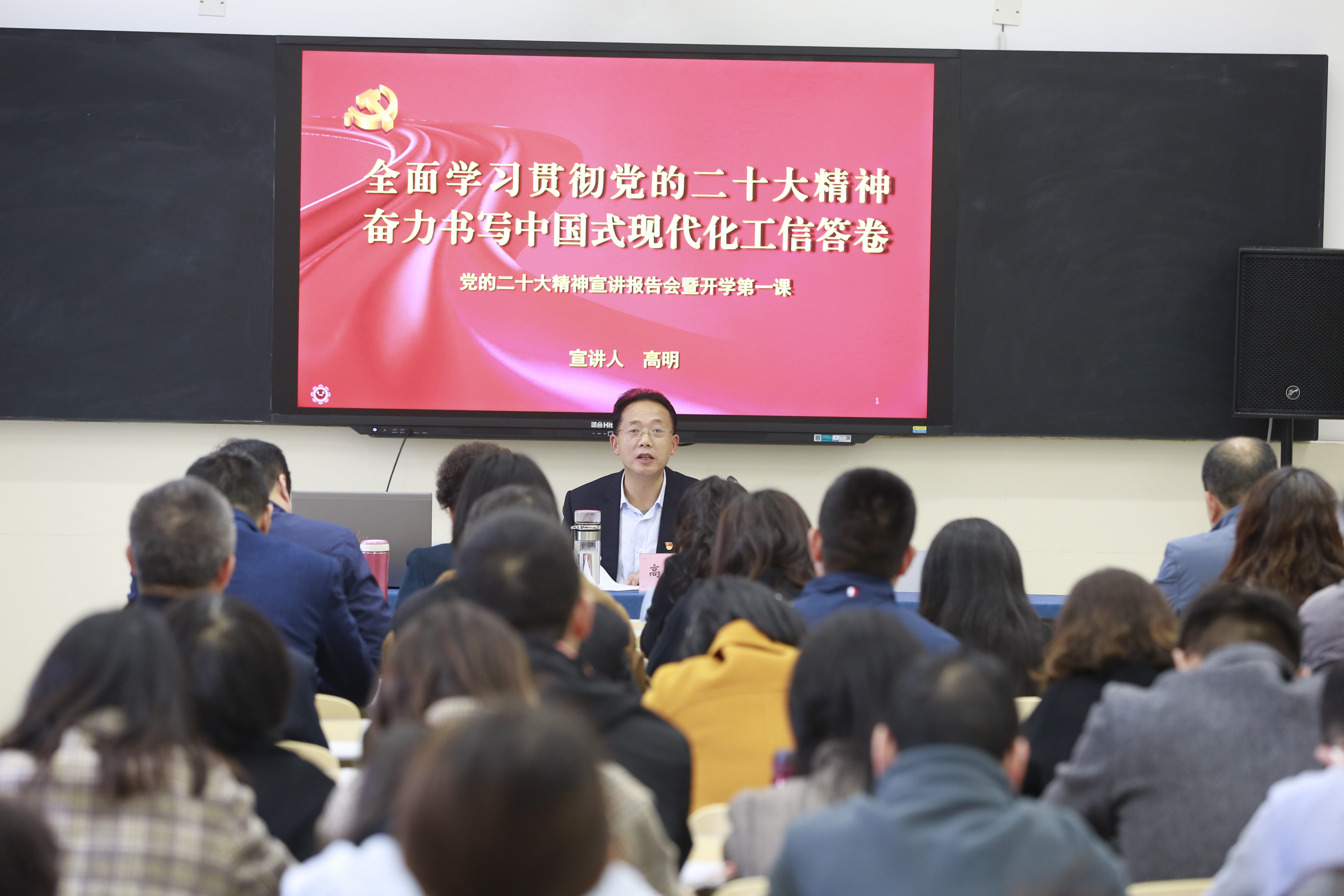 3月10日下午,重庆工信职业学院党的二十大精神宣讲报告会暨开学第一课在广知楼2207会议室开讲。会议由院长杜宏伟主持,党委书记高明主讲,全校教职工、部分学生代表参会。